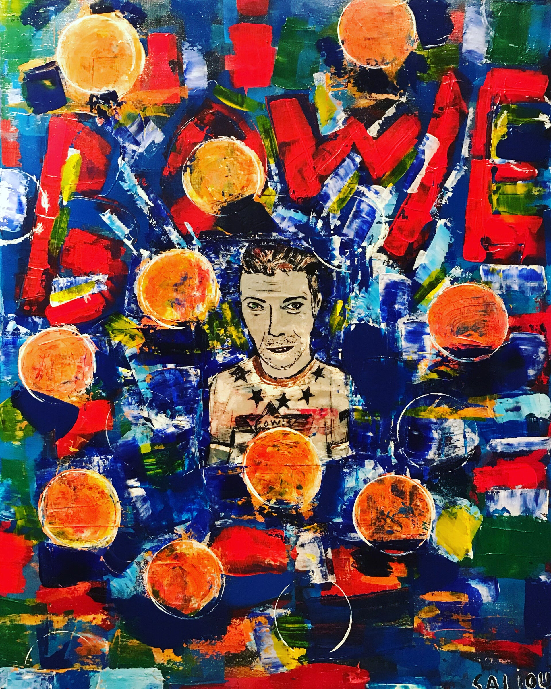In Jerome Saliou's work, the figure of David Bowie emerges as a visual and symbolic core within a dense, rhythmic, and strongly layered composition. The face, recognizable but treated in an almost graphic manner, appears immersed in a vibrant pictorial field, populated by circular forms that resemble orbits, planets, or lights suspended in space. Bowie here is not just a subject, but the center of a visual system that alludes to cosmic, mental, and symbolic dimensions. From a formal point of view, Saliou adopts an instinctive and gestural painting style, built through chromatic overlays and quick marks. The color — intense, contrasting, often applied in a thick manner — becomes the true engine of the work, evoking the tradition of Abstract Expressionism and Action Painting, but also a pop sensitivity in the choice of bright tones and the centrality of the icon.